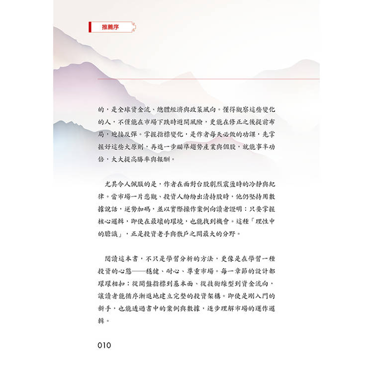 閱讀這本書,不只是學習分析的方法,更像是在學習一種投資的心態──穩健、耐心、尊重市場。每一章節的設計都環環相扣:從開盤指標到基本面、從技術線型到資金流向, 讓讀者能循序漸進地建立完整的投資架構。即使是剛入門的新手,也能透過書中的案例與數據,逐步理解市場的運作邏輯。