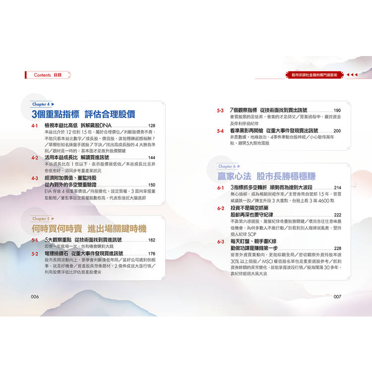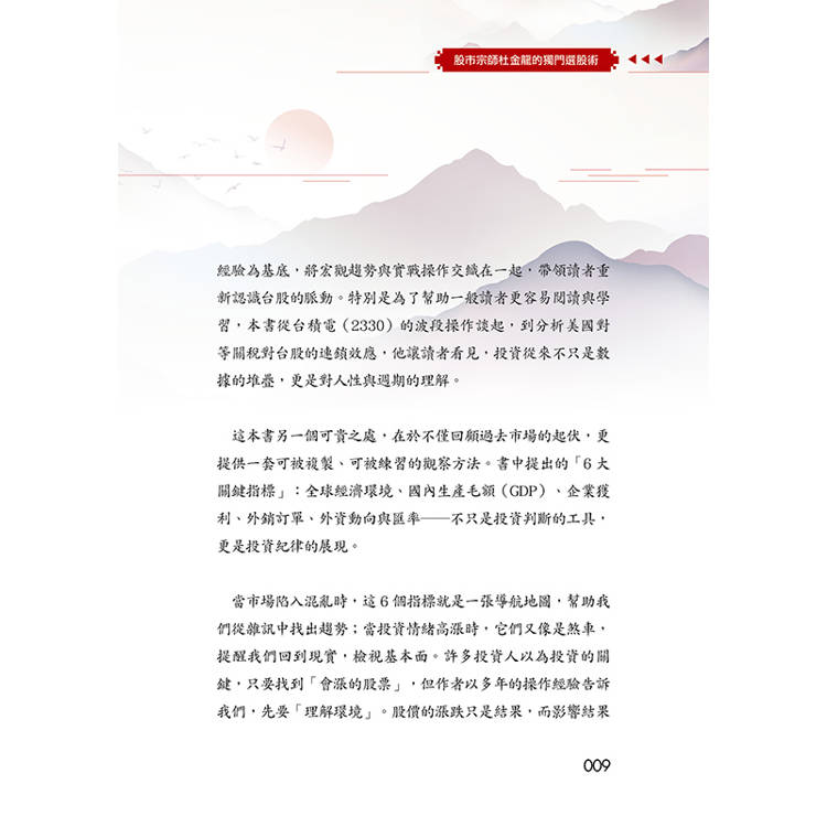 這本書另一個可貴之處,在於不僅回顧過去市場的起伏,更提供一套可被複製、可被練習的觀察方法。書中提出的「6大關鍵指標」:全球經濟環境、國內生產毛額(GDP)、企業獲利、外銷訂單、外資動向與匯率──不只是投資判斷的工具, 更是投資紀律的展現。