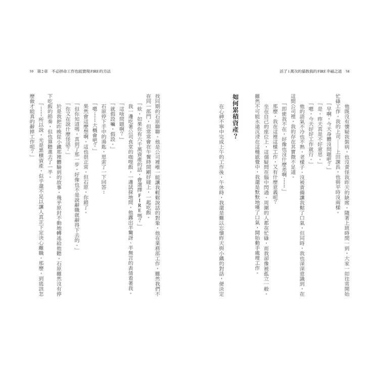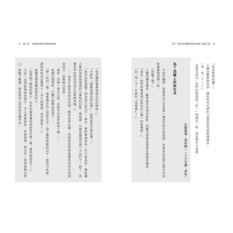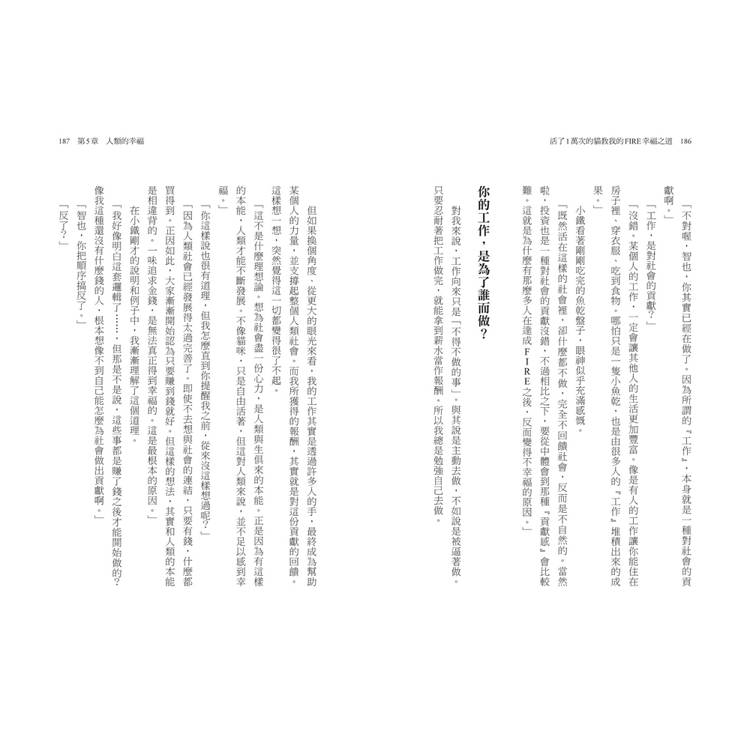 ‧故事化呈現:以主角智也與會說話的貓咪小鐵的對話,呈現FIRE規劃、人生抉擇與心靈反思。