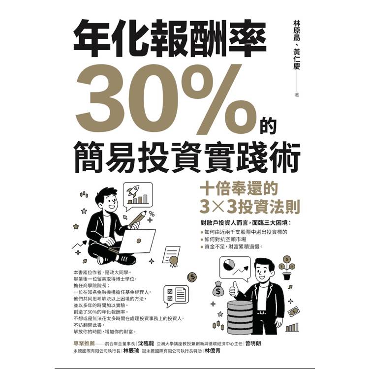 本書兩位作者為大學同學,背景橫跨學術與實戰。—位是赴美取得博士學位並返國任教的商學院教授,另一位則是於金融機構任職的專業投資經理人。他們運用書中方法實戰多年,達成累積年化報酬率30%的卓越績效。由於投資標的明確固定,能為投資人省去大量選股的時間與困擾,對非專業人士的財富累積助益極大。這是一套能讓投資人 「看得懂、做得到、可複製」的完整實戰系統。