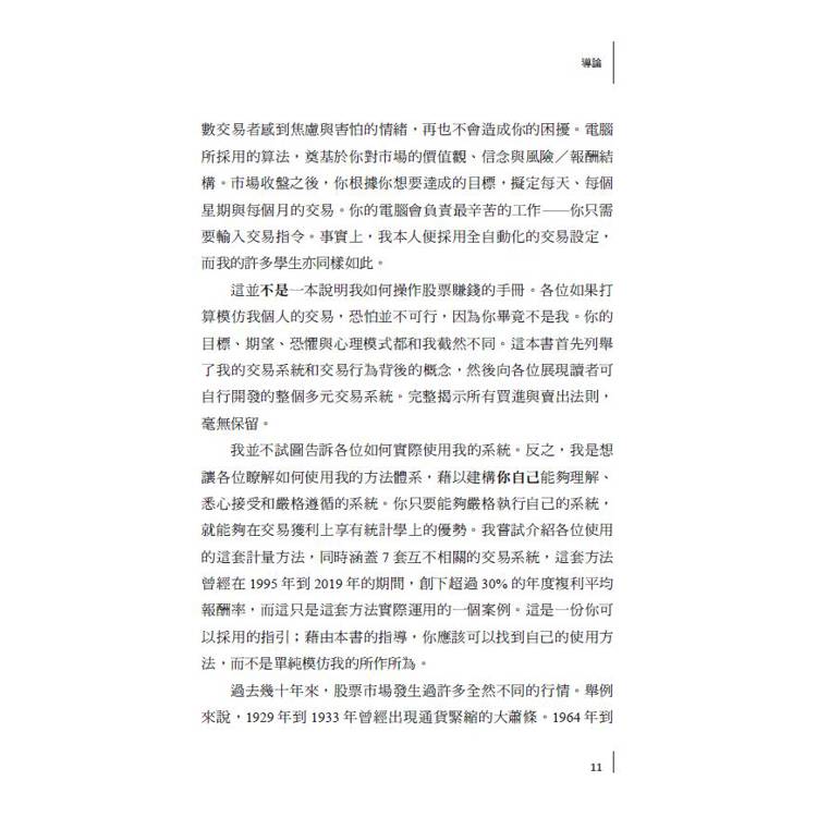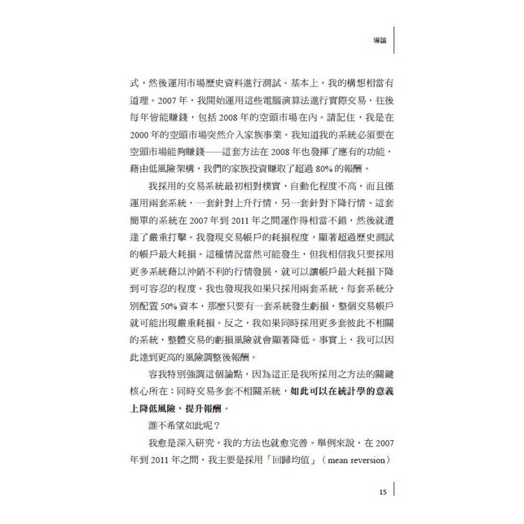 在《股票自動交易系統》一書中,本斯多普詳細揭示一種非相關、多系統的整合方法,讀者不僅能理解其背後的原理,還能依自身情況加以實作。他運用歷史價格數據,開發出具統計優勢的交易策略,並將這些策略自動化整合。過去 24 年的模擬紀錄顯示,該系統能在市場指數表現平平時,依然穩定創造高雙位數的報酬,同時將回檔控制在極低水準。