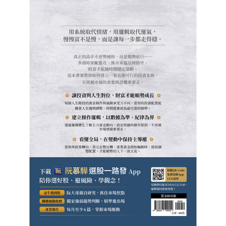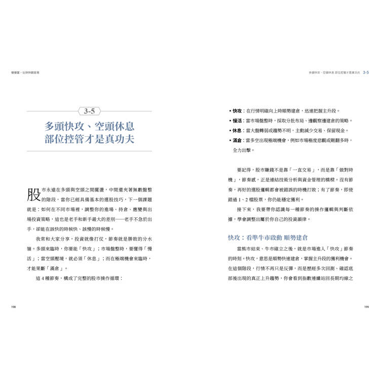 他說:「慢慢富,不是慢,而是節奏對。」真正的高手不逆勢硬拚,而是順勢前行──多頭時果斷進攻,熊市來臨及時防守,財富才能隨時間穩定滾動。這本書要教你如何建立一套長期可行的投資系統,讓你不再被市場的貪婪與恐懼牽著走。