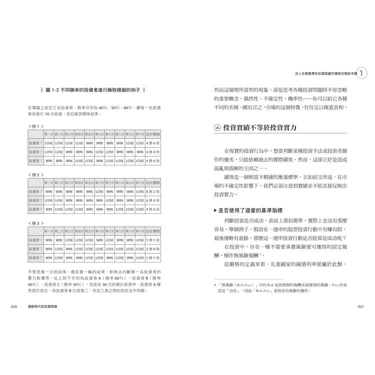 雖說投資理論涉及「不確定性」與「機率理論」,但無需陷入過度學術性的抽象討論。本書重點並非學術上的嚴謹性或理論歸納,而是盡力幫助讀者以直觀的方式理解現實市場的結構。就投資理論而言,這種方式反而更具功能性。