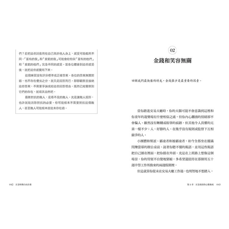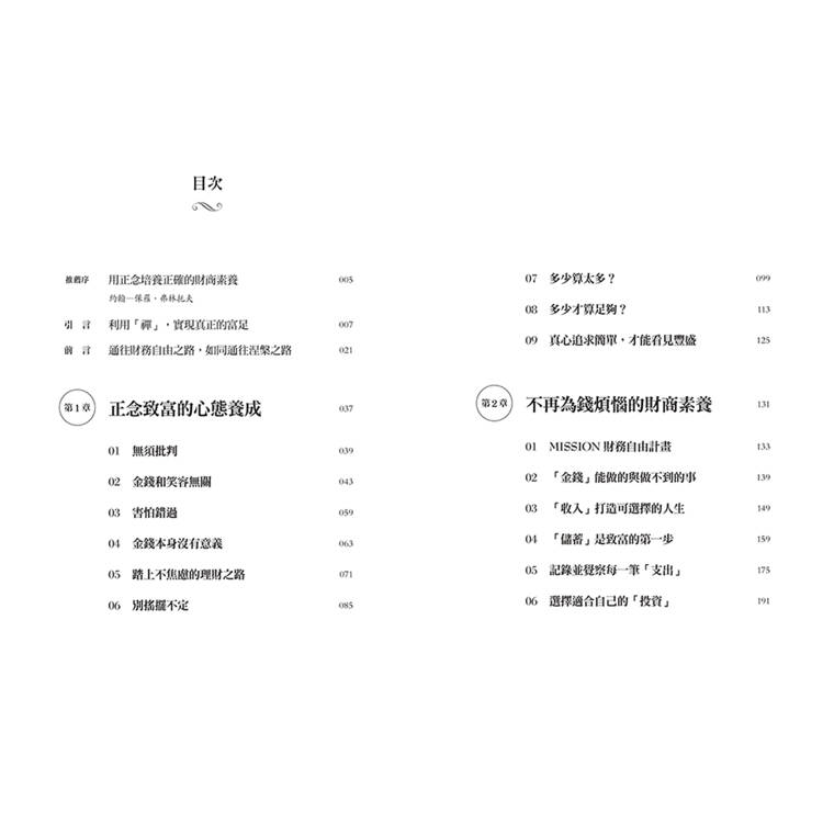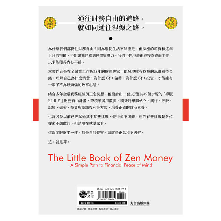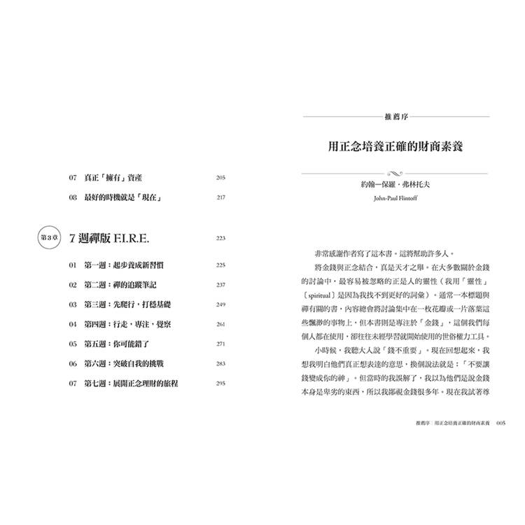 結合多年金融實務經驗與正念冥想,他設計出一套以7週共49個步驟的「禪版 F.I.R.E.」財務自由計畫,帶領讀者用散步、刷牙時單腳站立、爬行、呼吸、記帳、儲蓄、投資與認識複利等方式,培養正確的財商素養。