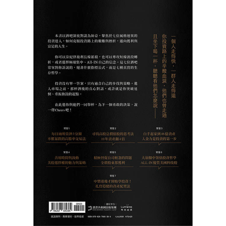 本書以酒吧深夜對談為舞臺,聚焦於七位風格迥異的投資達人,如何克服投資路上的艱難與挫折,邁向獲利與富足的人生。不論是從零開始慢慢翻身,還是歷經重大挫敗後重寫策略,從他們的故事裡,你不只能學到「選股技巧」或「操作策略」,更能看見面對痛苦與風險的勇氣與韌性。