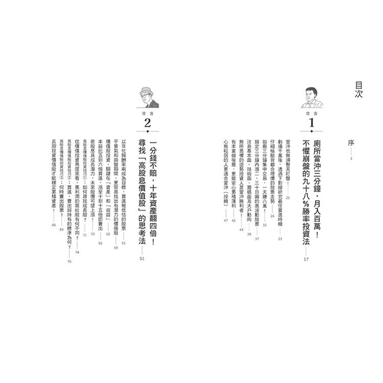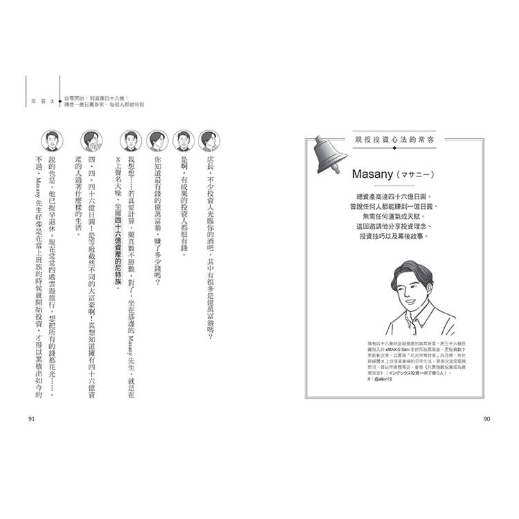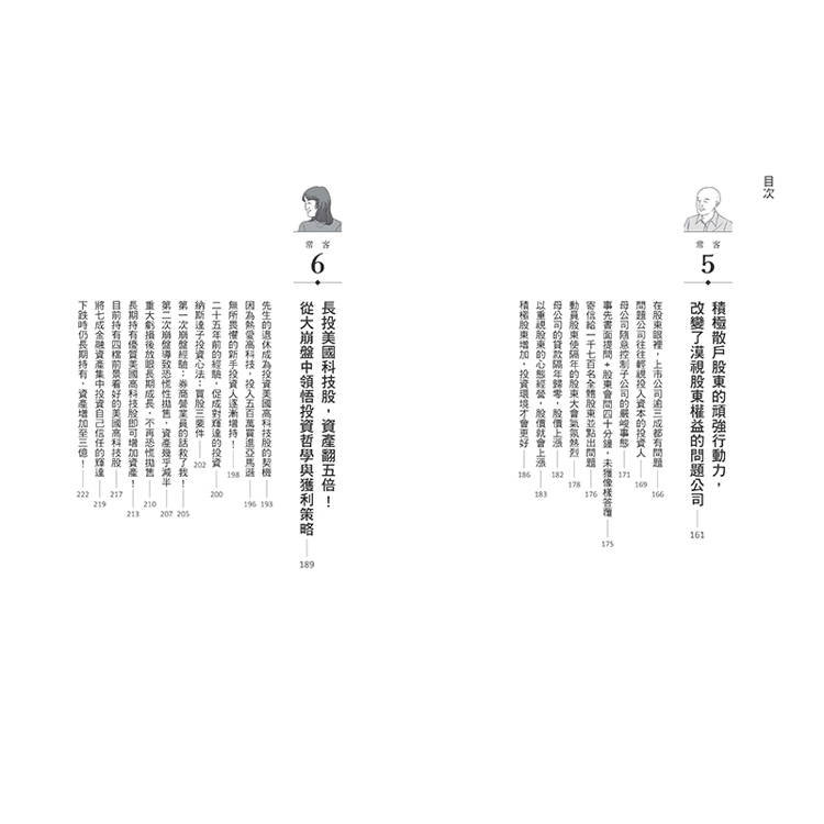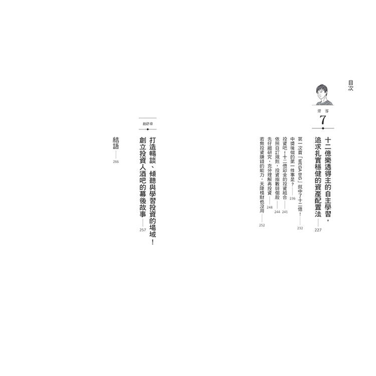 ▶淺顯易懂的投資故事。書中幾位投資人在各個章節輪番登場,透過與酒吧顧客對話的形式展開故事。這些對話內容引人入勝,簡單易懂的講解對投資而言極具參考價值。