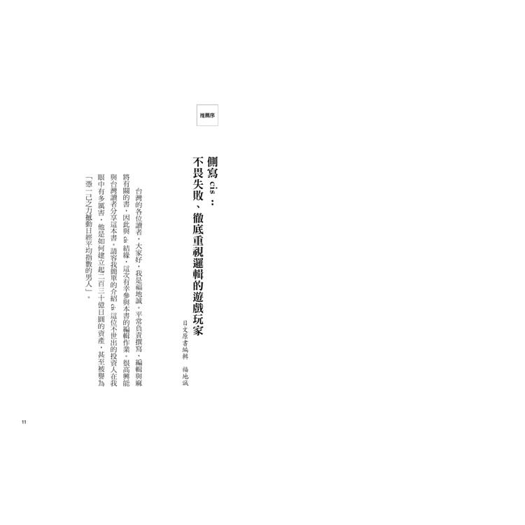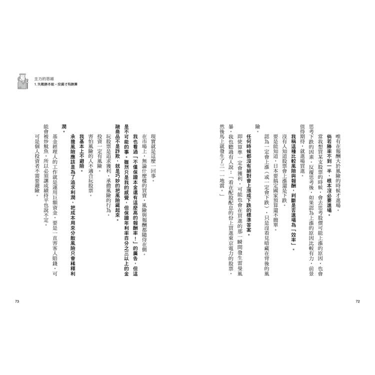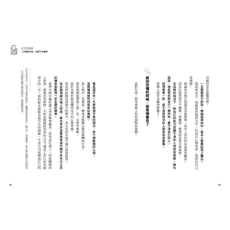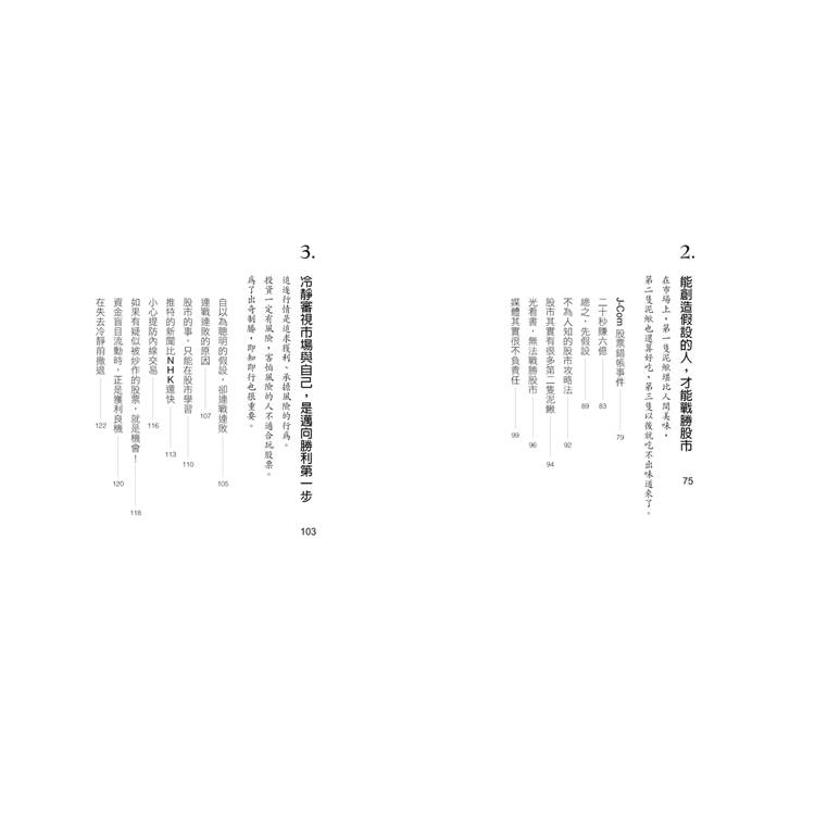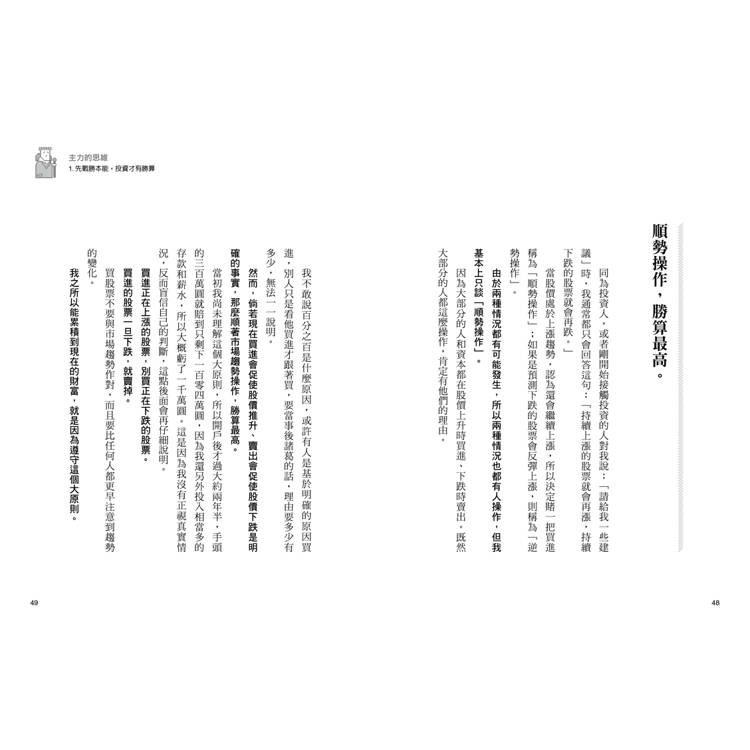 我把自己面對股市時是如何思考、行動,以及如何出奇制勝的方法整理成這本書,雖然是以股票為主,其實就連對股票不是很了解的人也看得下去。不只是股票,希望各位在面對人生的各種考驗時,本書也能提供脫穎而出的參考。」