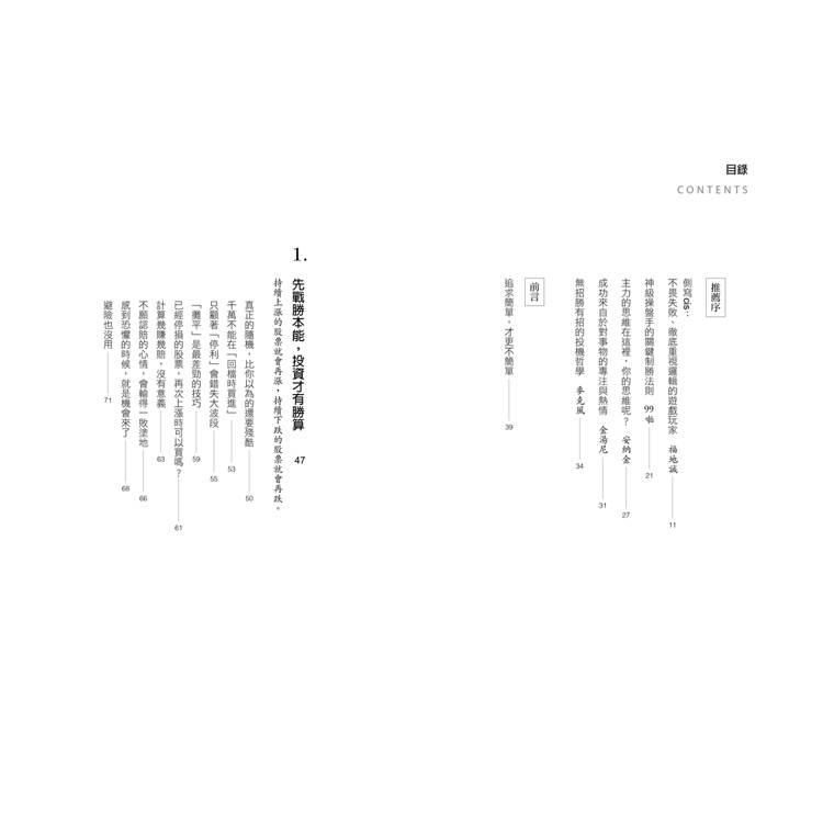 關於我如何靠股票賺錢的方法,或許讀者讀完後會覺得我好像講得很淺顯簡單,但我要向各位讀者坦承,和其他投資人相比,我確實沒做過什麼特別困難的事,我的哲學是事情能簡單就盡量簡化。可也正因為追求簡單,所以如何將關鍵與重點提煉出來,成為一件沒那麼簡單的事。