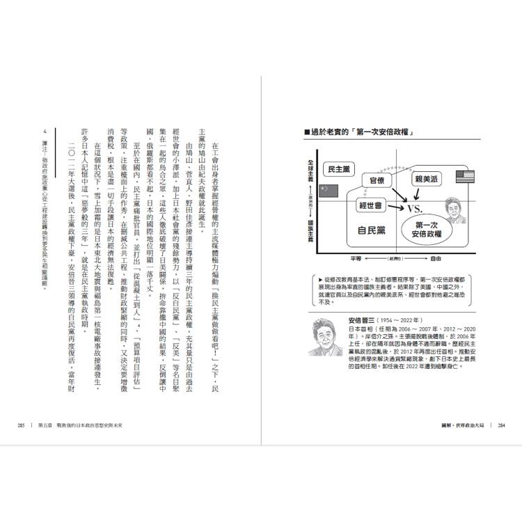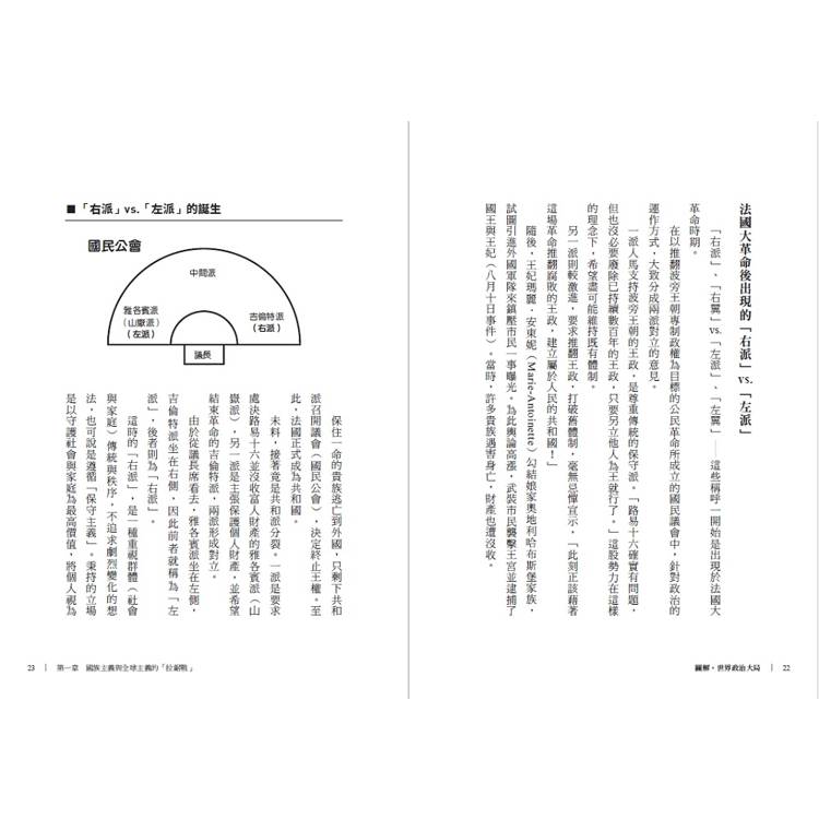 最值得稱道之處,在於作者以簡潔清晰的圖表輔助論述,譬如成功將社會主義與共產主義的歷史脈動以「由繁入簡」的方式呈現,展現深厚的分析功力。作者的核心主張是傳統左右派的思想框架已難以捕捉當代政治現象;在多元價值與利益交織的情境下,各國政黨在政治光譜上的界線愈發模糊。以美國為例,川普身為共和黨領袖,理應代表右派立場──卻對自由貿易持否定態度,並獲得「鐵鏽州」勞動階層支持,這些勞動者過去都是民主黨的支持者。顯示其政策與美國保守陣營傳統取向大相逕庭。此種左右混雜、跨階級動員的政治局勢,對臺灣讀者而言或許相對陌生,然而掌握此趨勢,是我們理解歐美與日本當代政局之基本條件。本書正是一個很好的選擇。