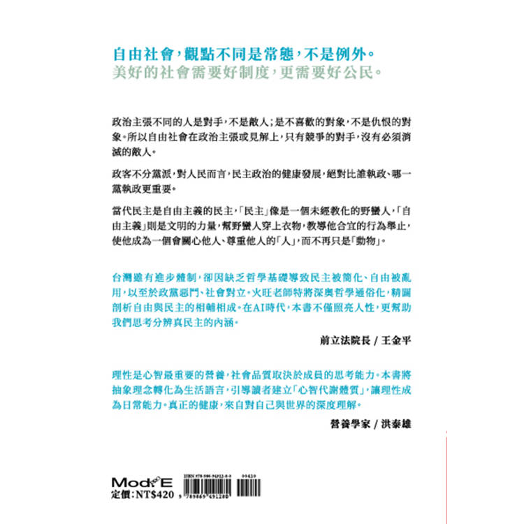 「台灣雖有進步體制,卻因缺乏哲學基礎導致民主被簡化、自由被亂用,以至於政黨惡鬥、社會對立。火旺老師特將深奧哲學通俗化,精闢剖析自由與民主的相輔相成。在AI時代,本書不僅照亮人性,更幫助我們思考分辨真民主的內涵。」——前立法院長 王金平