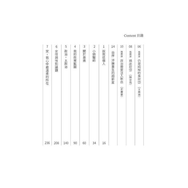 今天欣岱出書,我願意推薦她的書,如同我願意推薦她的人。我看到熱情以及奉獻以及從一個母親愛孩子延伸出來愛這塊土地的大愛。人出名了都會被放大鏡檢視,但我一直秉持一個原則,沒有人是聖人,人都會犯錯,重點在於是否自知、是否自省。吳醫師願意嘗試也願意努力,願意承認錯誤並且從中學習;最重要的是,為了台灣人民的心意沒有搖擺,沒有中間路線。