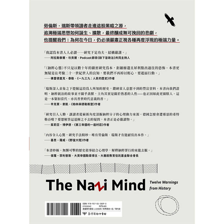 「《納粹心態》不只是以數十年的縝密研究為本,鉅細靡遺且犀利點出過往的恐怖。本書更無疑是在考驗二十一世紀世人的良知,要我們不再掉以輕心,要起而行動」