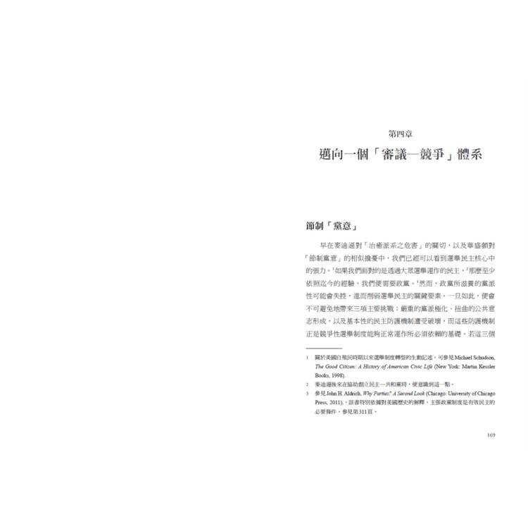 在世界各國,雖然政黨競爭已經是達成某種民主形式的主導模式,但它不是培養各種民主實踐的唯一模式。隨著探索如何使審議成為具強健的政黨競爭的現代民主之治理的一部分,我將會週期性地回到古希臘雅典城邦與麥迪遜的理論這兩個案例上,不過這兩個案例都完全缺乏任何有組織的政黨。之後,我將考慮到的問題是,即使在有政黨競爭的民主體制中,我們如何可能使用審議來限制「黨意」(spirit of party)。