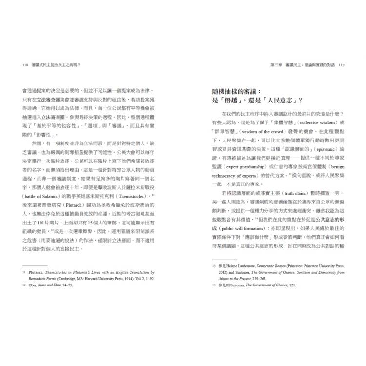 一個有力量且精練的民主願景,其中審議的機制補充了競爭式民主正處於困境中的機制,並支持了審議性的社會。在民主方案似乎拋錨或倒退的時代,這是一本迫切需要、及時出現並且必讀的書。