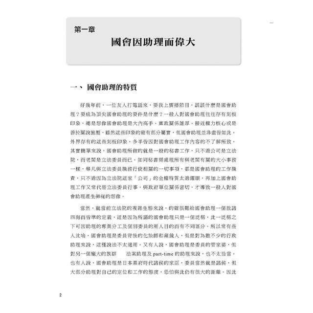 作者是相當資深的國會助理,她把多年來的實務經驗整理出來,內容豐富且極具實用性,就像立法院的一面鏡子,既凸顯國會助理的多元角色,也映照出立法院的百態,值得有心了解立法院或有志成為國會助理的人,用心一讀。—黃清龍,前中國時報副總編輯、旺報社長