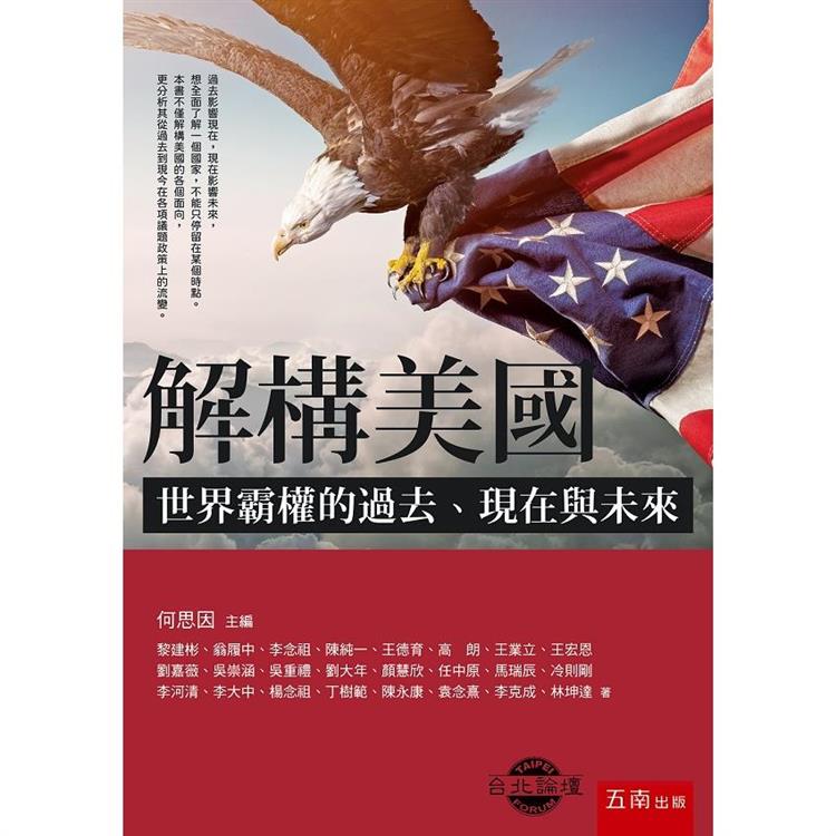 思因兄這次邀集的作者群真乃一時之選。有長期研究美國的台灣一流學者,有具備與華府或州政府打交道經驗的前政府官員,也有將近三分之一作者是身在國外大學開設相關美國課程的資深教授。這個組合在今天的台灣絕對是個難得一見的黃金拍檔。思因兄特別拜託他(她)們「要深入淺出,因為本書不是學術著作,而是半學術、半科普」,「要控制字數,因為太長了讀者會累」。這對滿肚子學問的作者群來說,真的是太委屈了!