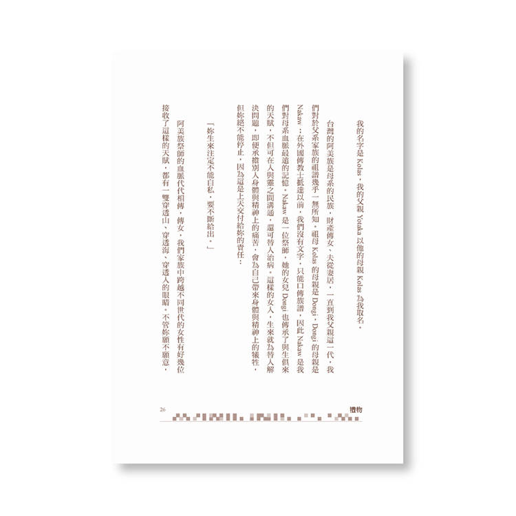 本書作者Kolas Yotaka,以流動與包容為核心概念,探討台灣多元認同、歷史創傷與文化延續,並思考在地緣政治緊張中如何維持和平與主體性。它既是個人的生命敘事,也是世界理解台灣的窗口。書名「禮物」象徵認同與和平的選擇——台灣多元的認同,是獻給世界最真實的禮物。