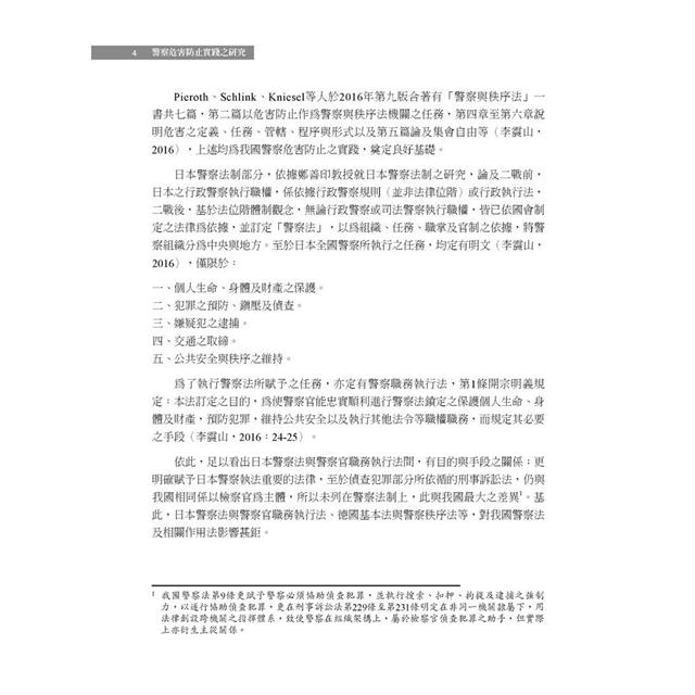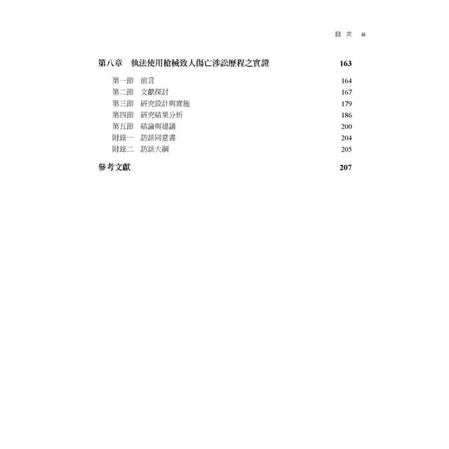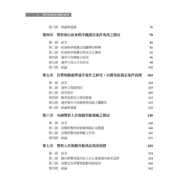 第四部分:著重在實踐危害防止之際,遭受不法侵害用槍議題之探討,分布在本書第六章之各國警察人員執勤用槍規範之探討、第七章之警察人員用槍涉訟現況初探、以及第八章之執法使用槍械致人傷亡涉訟歷程之實證研究等。