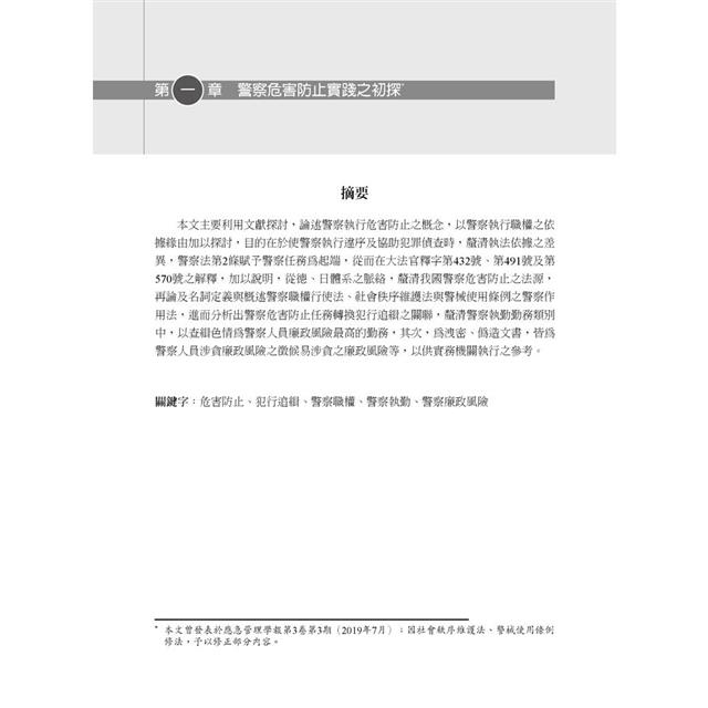 本書將警察危害防止實踐之理論與實踐、職權行使所衍生廉政風險之態樣與決意、分析警察處理違序案件現況與裁定之趨勢、各國警察執勤用槍之現況規範、執法使用槍械致人傷亡之責任、涉訟歷程等議題加以解析。