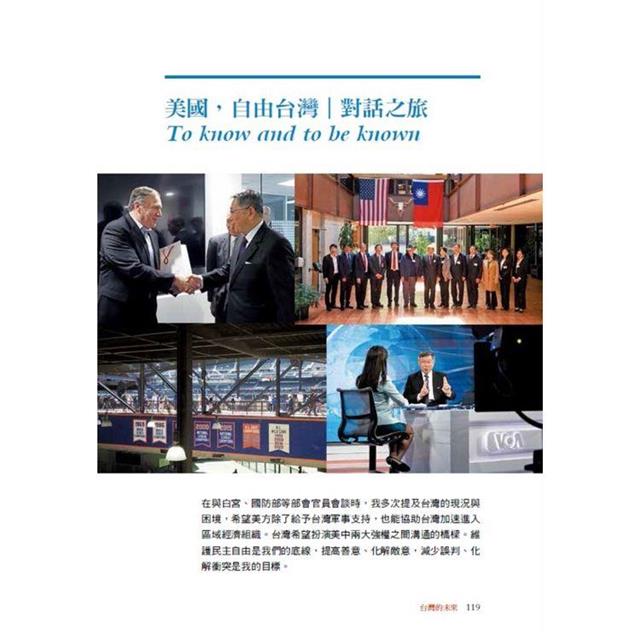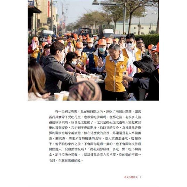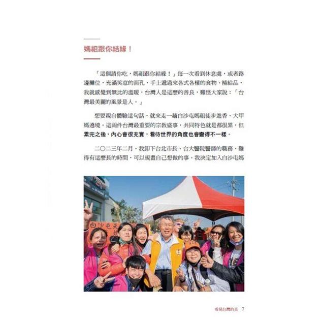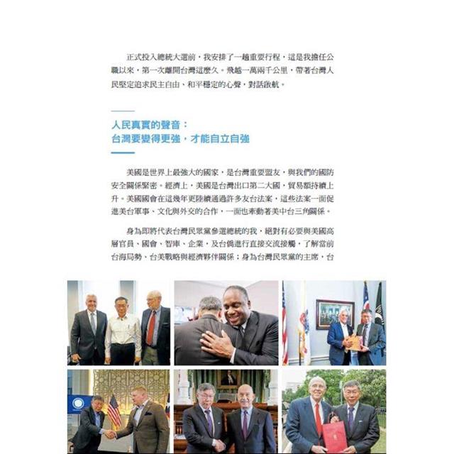 這本書是我卸下台北市長職務後,再度走訪台灣鄉鎮,看見充滿生命力的能量,不論是宗教的心靈洗滌、地方百業的拚搏精神、年輕人的旺盛企圖,以及為台灣現在與未來奮鬥的人事物,都讓我往前進的腳步更加堅定。書中還有我飛越千山萬水開啟的民主對話,將台灣人民的心聲向世界發聲。