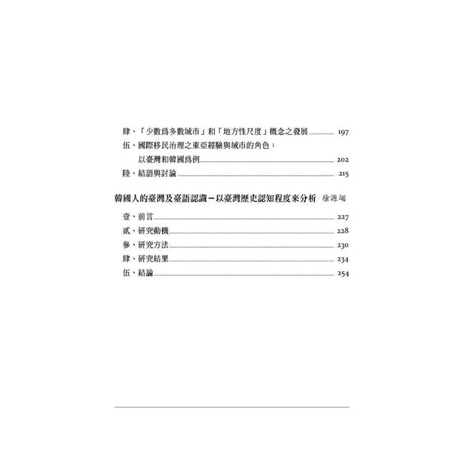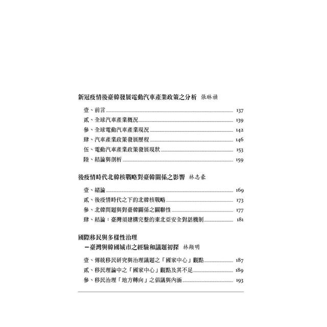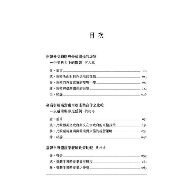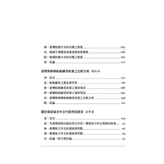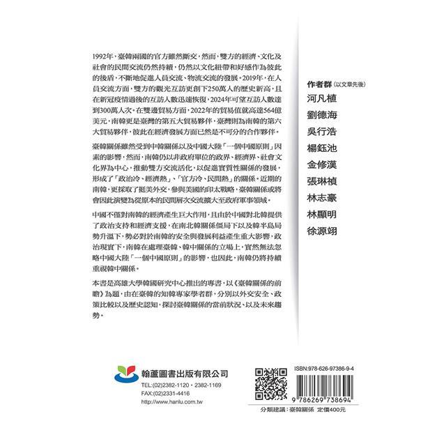 本書是高雄大學韓國研究中心推出的專書,以《臺韓關係的前瞻》為題,由在臺韓的知韓專家學者群,分別以外交安全、政策比較以及歷史認知,探討臺韓關係的當前狀況、以及未來趨勢。