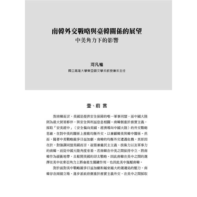 南韓外交戰略與臺韓關係的展望-中美角力下的影響/河凡植
