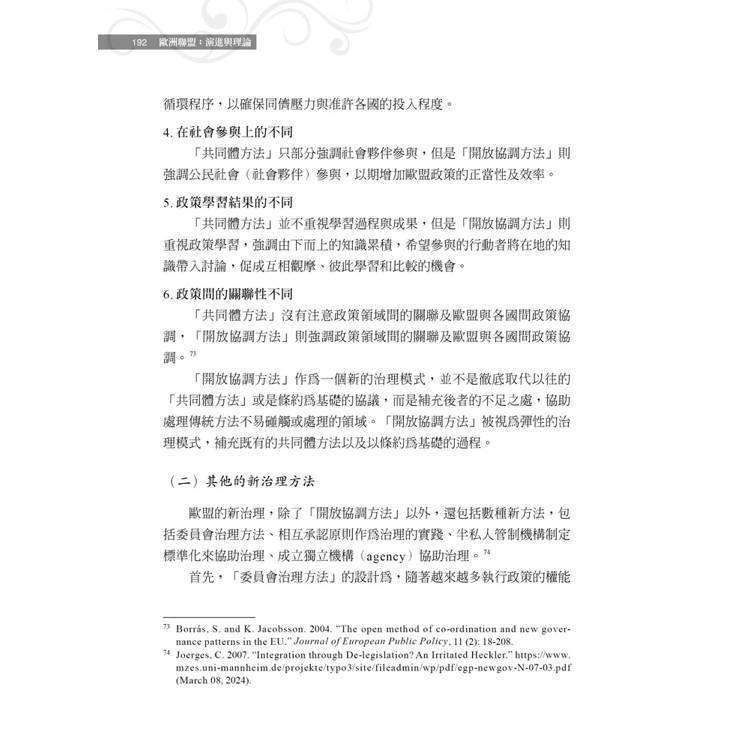 第七章則探討政府間主義的理論,重點分析其對於歐洲統合的挑戰與批評。這一章特別關注各國主權的維護在這一過程中的重要性,並探討政府間主義如何在保護國家利益的同時促進歐洲的合作。我們還考察當前的政治環境如何影響政府間主義的發展。
