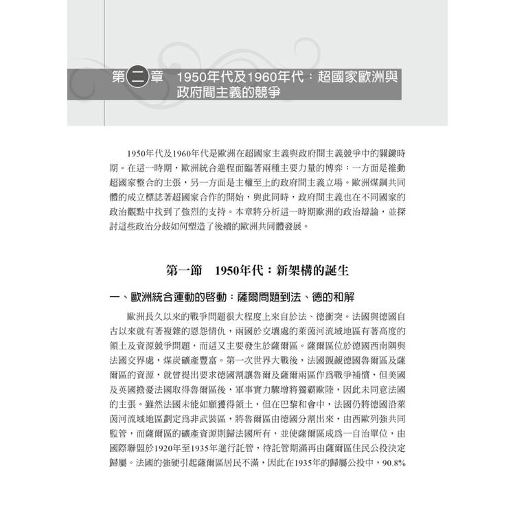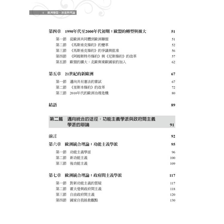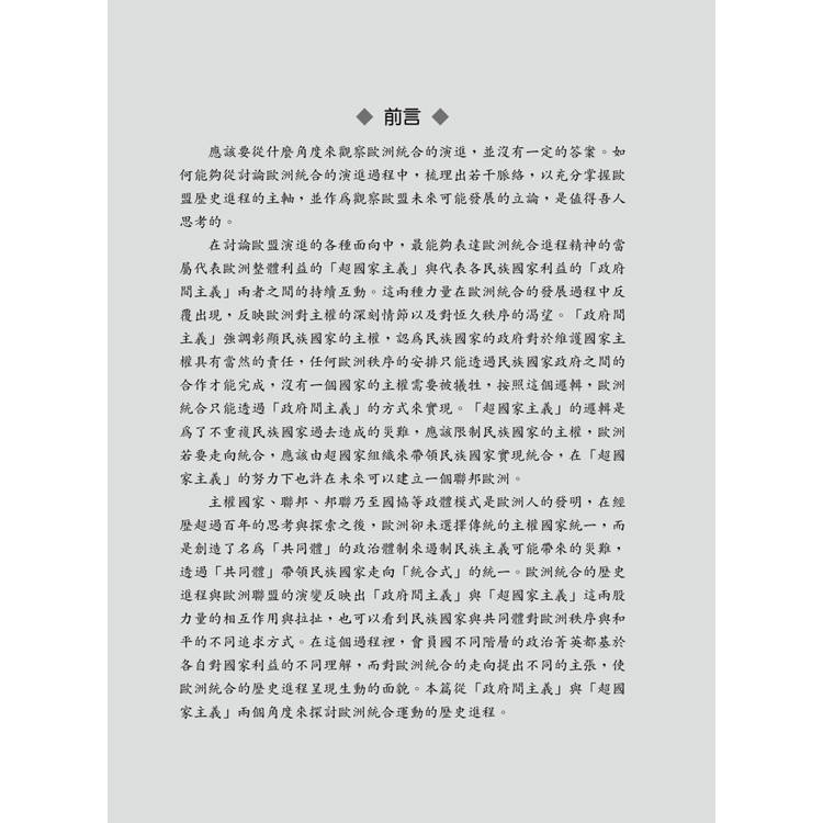 本書分為兩大篇章,第一篇從歐洲的歷史發展出發,回顧從最初的和平構想到歐洲共同體的誕生,再到冷戰後歐盟的擴展與改革過程,深入分析不同國家在歐洲統合中的立場與政策,並探索政府間主義與超國家主義的相互作用與影響。第二篇則聚焦於學術界對歐洲統合的多元詮釋,從聯邦主義、功能主義、新功能主義、後功能主義、社會建構主義、制度主義、治理理論等多角度,剖析學者們對這一過程的不同看法,為讀者提供全面的理論視野。