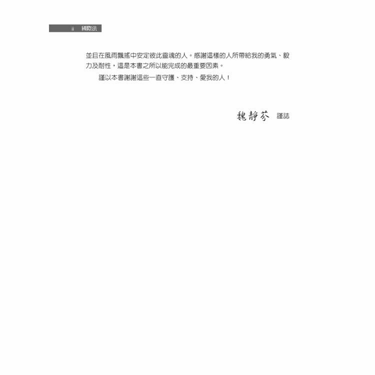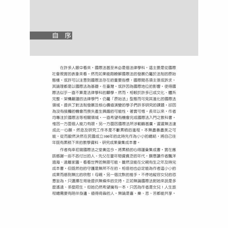 作者有幸初窺國際法之堂奧迄今,將累積的心得謹彙集成書,實在應該感謝一些不吝付出的人。先父在當年物資貧乏的年代,願意將作者飄洋過海、遠離家園,看看世界的無限可能;雖然沒能在父親有生之年及時完成本書,但既然他的守護是無所不在的,相信他也必定能為作者這小小的成果而感到無比的欣慰!母親,另一個沈默的推手,不停地縱容女兒的恣意妄為,只選擇在背後提供無條件的支持;正如無論國際法對她來說是多麼遙遠、多麼陌生,但她仍然希望擁有一本,只因為作者是女兒!人生旅程總需要有陪伴身邊、值得倚靠的人,無論是喜、樂、悲、苦都能共享,並且在風雨飄搖中安定彼此靈魂的人;感謝這樣的人所帶給我的勇氣、毅力及耐性,這是本書之所以能完成的最重要因素。
