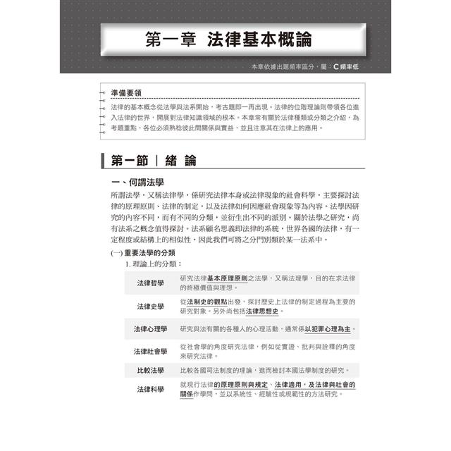 也因為法條要記憶的重點和關鍵內容實在太多,所以書中不僅將重要的關鍵內容以粗體字+底線標示,閱讀時更加醒目且有助於記憶,另外,也特別將一些容易混淆或是忽略的重點以「法學小教室」的小視窗方式呈現,很容易便能注意到內容,如果在考前想要釐清或快速複習一些觀念,「法學小教室」的小視窗短短的內容,可以讓你有效率地加強觀念。