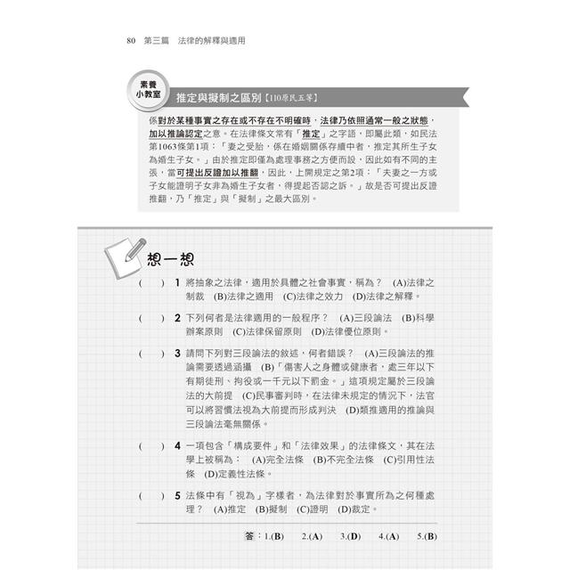 將重要的法律,如憲法、行政法、民法、刑法及訴訟法等,做重點系統複習,從基本知識、法律制定、效力、解釋與適用、制裁,乃至於司法救濟與各別重要法律內容,一舉囊括,內容以粗體標示關鍵字、架構易讀好記,搭配「素養學堂」內容提點,讓你事半功倍!