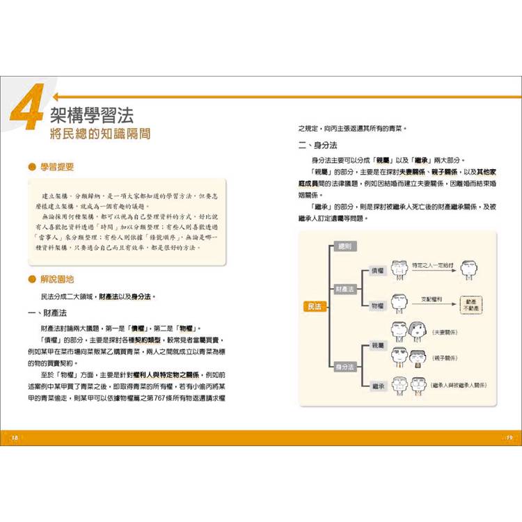 準備國家考試最怕囫圇吞棗,或是強塞死記法學知識,只要建立好架構,就能邊讀邊記憶,增加學習效率。許多人認為只要依照法條順序,就能瞭解該法體系。其實不然,尤其民法牽涉範疇廣大,若沒有像是整理好的資料夾一樣分門別類,遇到考題時往往就如同大海撈針一樣,無法從大腦深處提取正確的內容,並邏輯清楚地寫出正確答案。