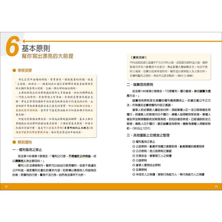 本書的設計理念即是先幫讀者抓出各章節的重點與體系位置,確立法學大框架,接著透過重點提要、內容解說讓讀者能夠在其中放置正確觀念,從發散到聚集、按部就班地建構穩固的法律知識,搭配趣味黏度高的法律記憶法,即使日後遇到複合型考題,也能輕鬆抓到重點,成功獲得高分。