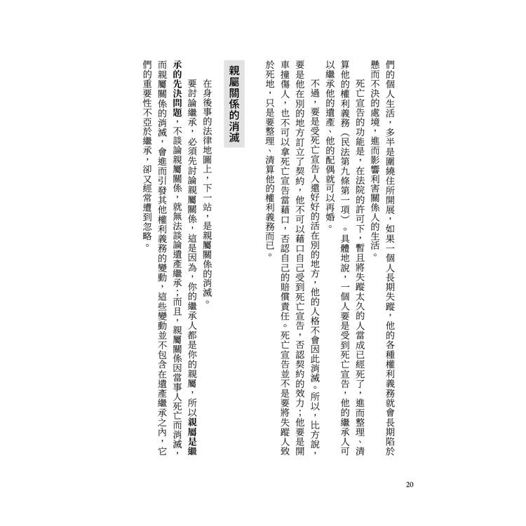 這是一本關於死亡的通俗法律著作,主題嘛,與其說是繼承,不如說,是人死掉以後的相關法律議題。說到死亡與法律的關聯,人們總是想到遺產、繼承與遺囑,這些都是本書將要探討的話題,但也不止於此。正如書名所示,這是我給讀者的叮嚀,我筆下的被繼承人,就是指正在閱讀此書的你而言。