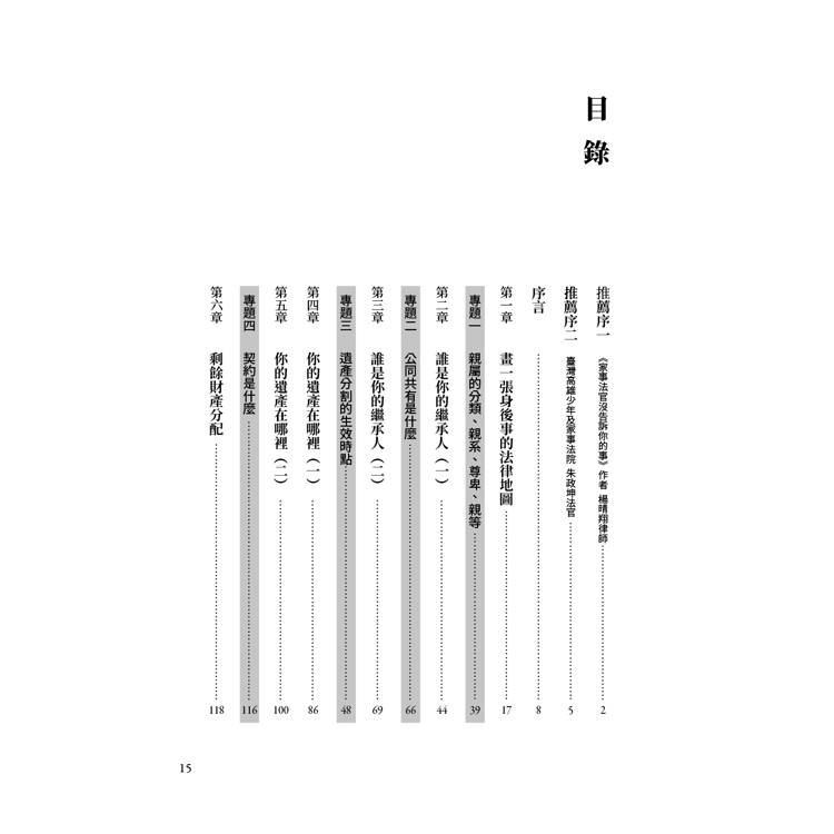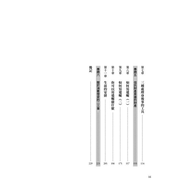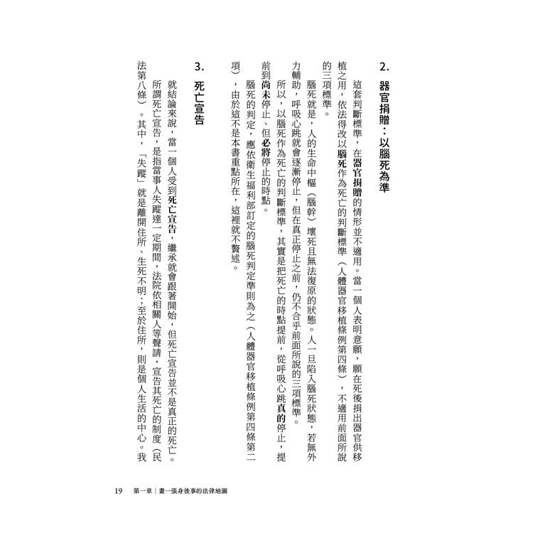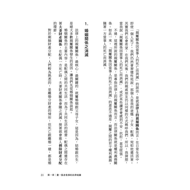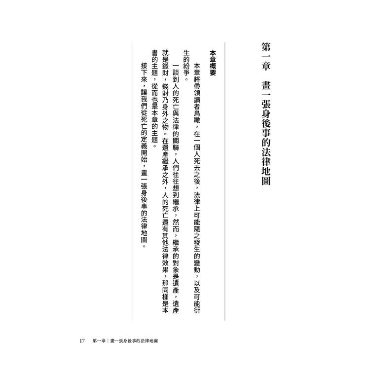 本書分為三大部分,第一部分是第一章「畫一張身後事的法律地圖」,將帶領讀者鳥瞰,在一個人死去之時,可能隨之發生的權利義務得變更,以及可能衍生的紛爭。