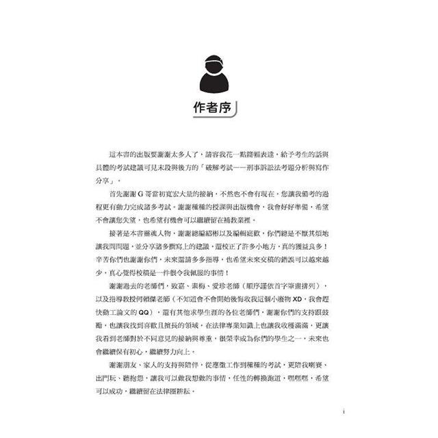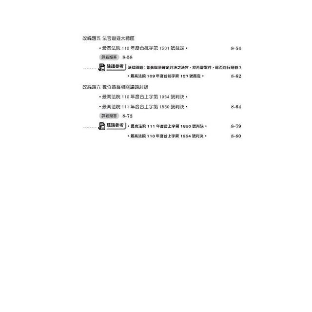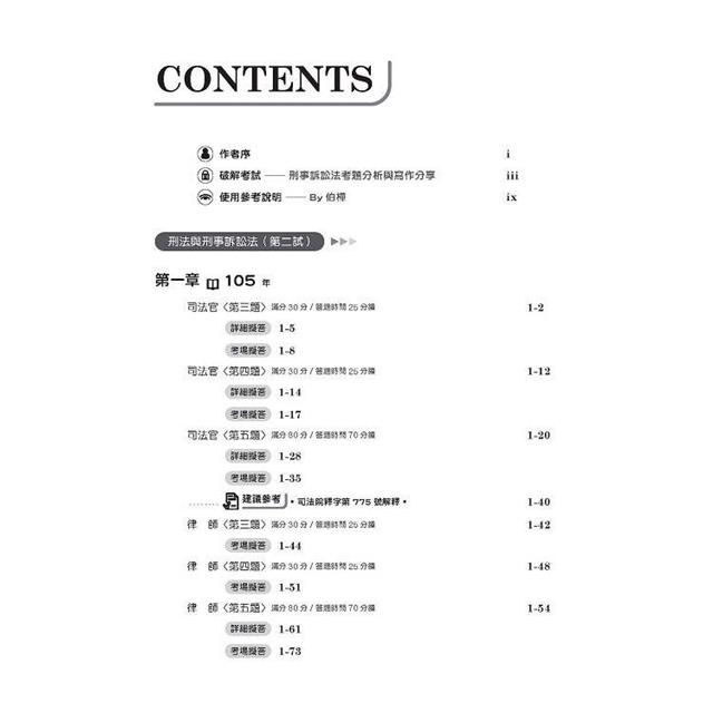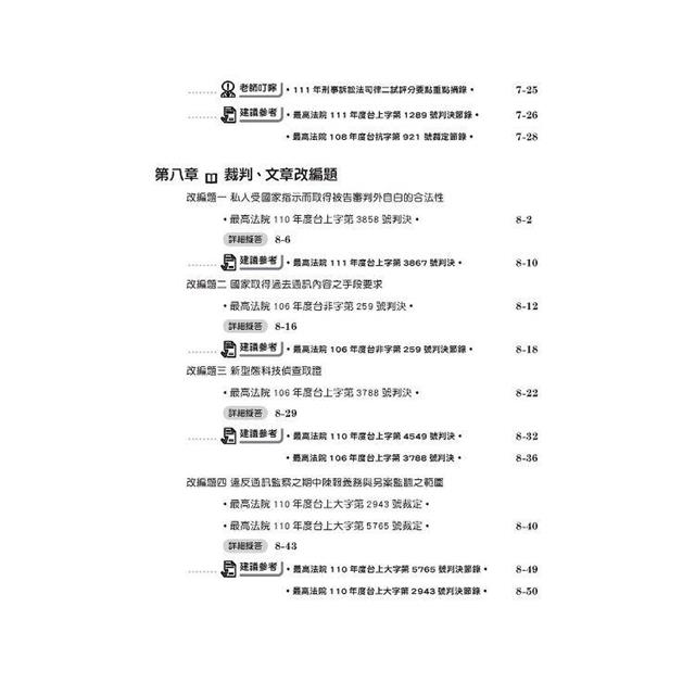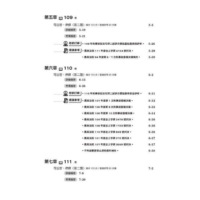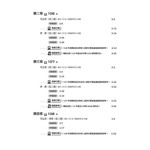 本書收錄105年至111年司法官律師第二試「刑事訴訟法」試題及作者擬答。「本題分析」、「爭點分析」、「作答方向」、「作答架構」澈底剖析試題;「關鍵段落」、「細節補充」穿插提醒;「老師叮嚀」補充解題要點、「建議參考」摘錄實務見解。第八章「裁判、文章改編題」共六題,由近年重要實務及學者文章改編,預測刑事訴訟法熱門考點。