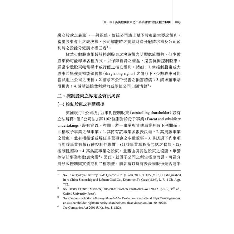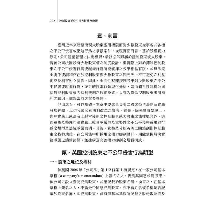然而,少數股東權利的保障並非否定控制股東的經營權,而是為了在權力行使與少數股東權利保障間取得衡平,本書以比較法方法為基礎,以系統性方式建構事前制衡與事後救濟兩大法律防線作為其法律界限,同時結合了扎實理論與指標性實務案例,不僅是法律從業者處理複雜股權鬥爭的實戰導引,更是優化投資環境、健全資本市場的重要參考指南。
