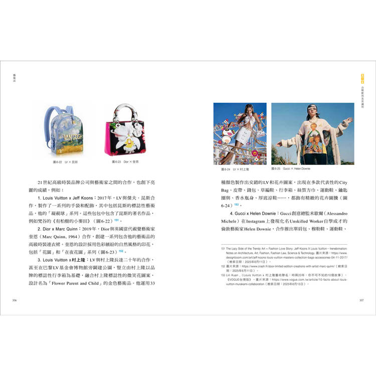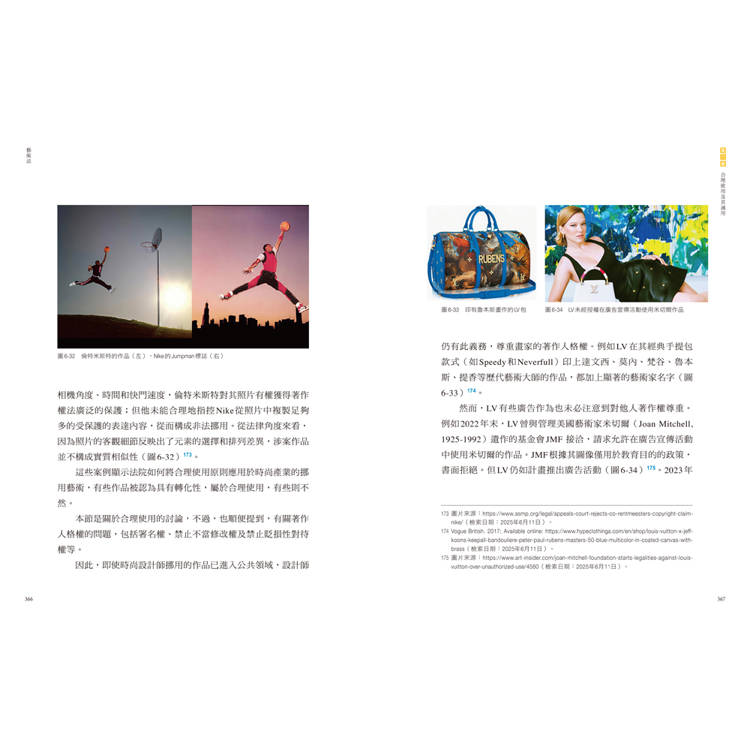因此,即使時尚設計師挪用的作品已進入公共領域,設計師仍有此義務,尊重畫家的著作人格權。例如LV在其經典手提包款式(如Speedy 和Neverfull)印上達文西、莫內、梵谷、魯本斯、提香等歷代藝術大師的作品,都加上顯著的藝術家名字(圖6-33)。
