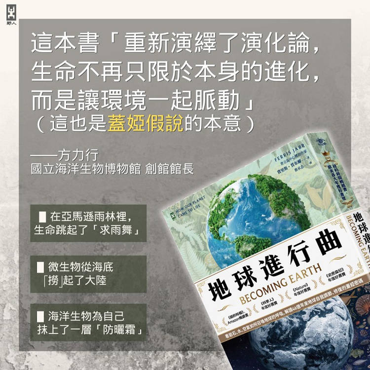 50年前,首次有科學家提出「蓋婭假說」,認為地球是「活的」,卻遭到主流科學界群起譏諷。直到現在,這項假說才真正獲得科學界證實!在本書中,賈布爾以岩石、海洋、大氣三大元素為架構,描繪出一個會呼吸、新陳代謝,甚至因發燒而啟動修復機制的活體星球。