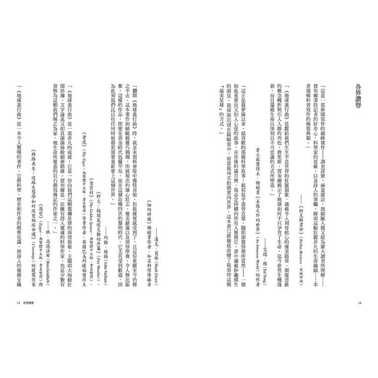「這是一部新聞寫作的巔峰傑作──調查詳實,涵蓋廣泛,既細膩入微又能為廣大讀者所理解……賈布爾秉持記者的好奇心、科學家的思維,以及詩人的筆觸,探索這幅壯麗非凡的生命織錦……本書堪稱科普寫作的極致典範。」