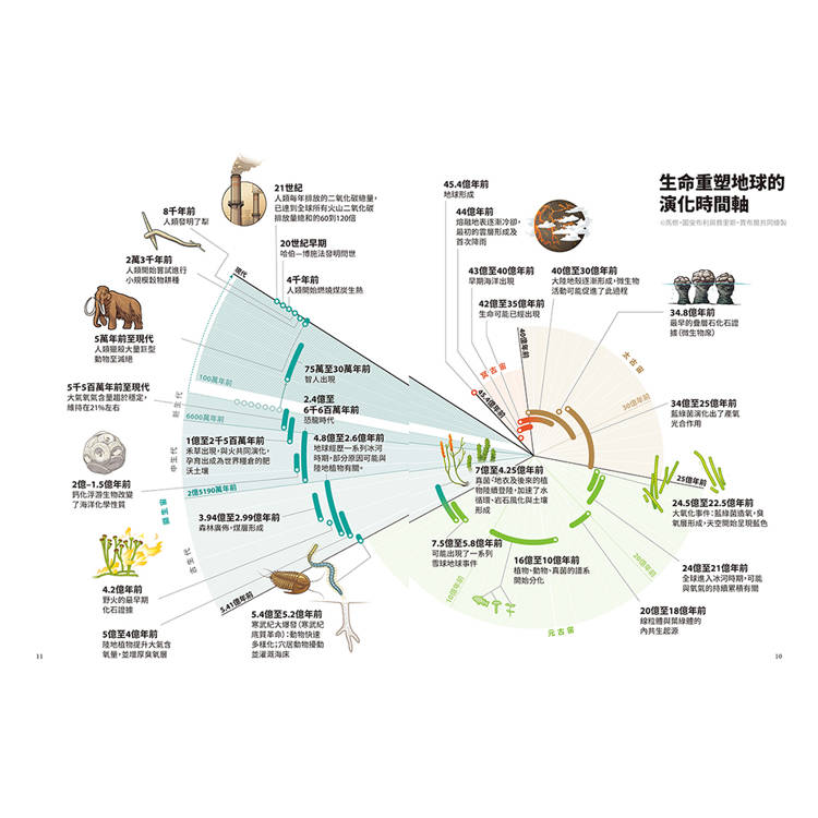 ★作者親製「地球演化圓盤年表」:將35億年的地質與生物交織史詩,化作一目了然的視覺圖譜,展現生命如何一步步改寫地球