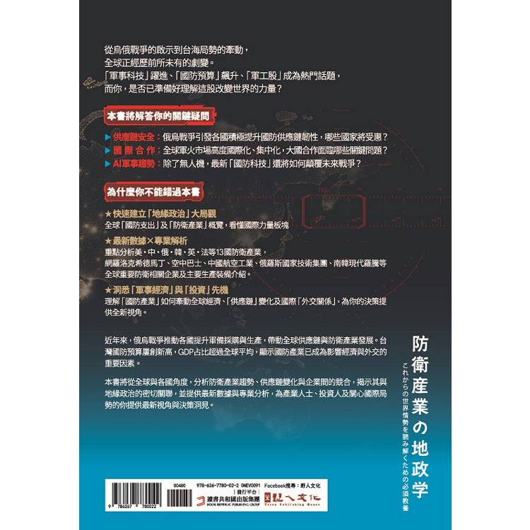 國際衝突不只牽涉交戰雙方及周邊國家,更對在背後支撐這些國家的國防產業有重大影響。本書分別從全球與各別國家的角度,解讀國防產業發展趨勢、供應鏈變化,更分別介紹各國重要相關企業與它們之間的「競爭與合作」,解析「國防產業」跟「地緣政治」的密切關連。