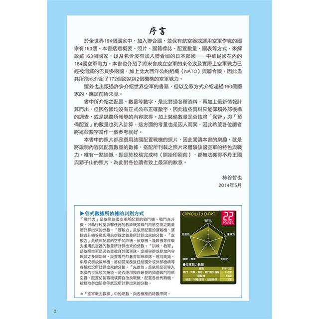 於全世界194個國家中,加入聯合國,並保有航空器或運用空軍作戰的國家有163個。本書透過概要、照片、國籍標誌、配置數量、圖表等方式,來解說這163個國家,以及包含沒有加入聯合國的日本鄰國──中華民國在內的164國空軍戰力。本書也介紹了將來會成立空軍的東帝汶及實際上空軍戰力已經被消滅的巴貝多兩國,加上北大西洋公約組織(NATO)與聯合國。因此盡其所能地介紹了172個國家與2個機構的空軍戰力。