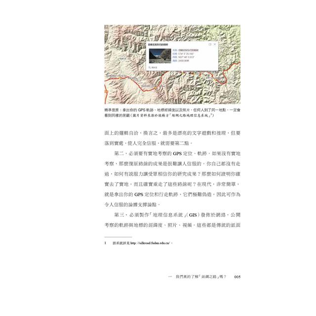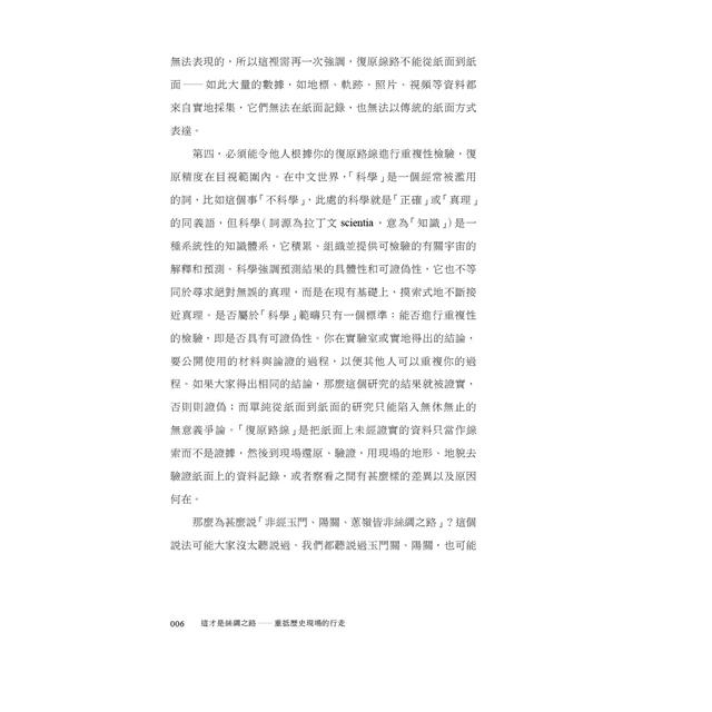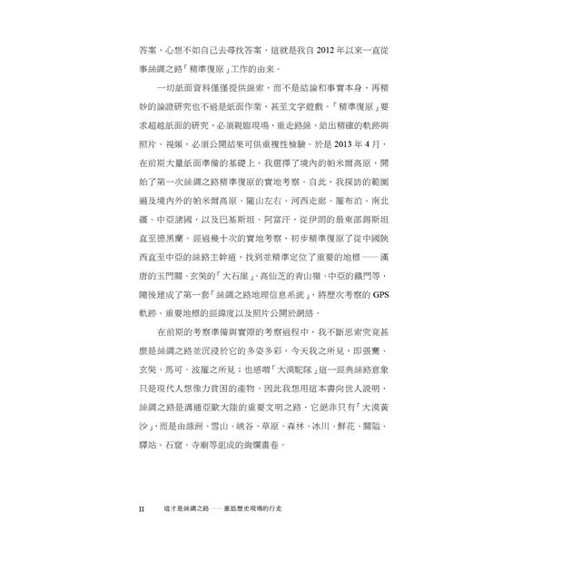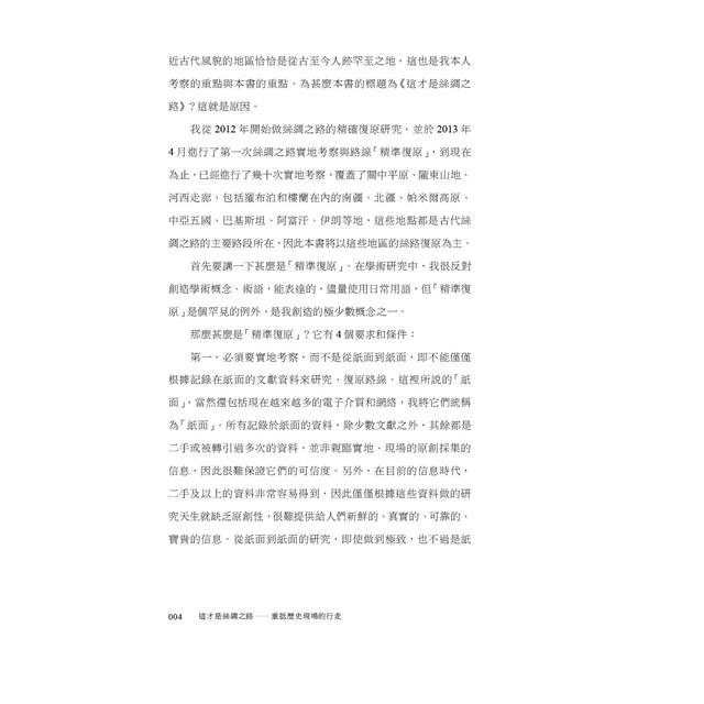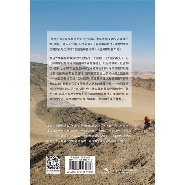復旦大學侯楊方教授在對《史記》、《漢書》、《大唐西域記》、近代探險家記錄等資料解讀和研究的基礎上,以歷時10年、超過20次、累計行程3萬公里重走絲綢之路的實地考察,採集精確的地理位置、路線軌跡及影像資料,精準復原歷史上多條絲綢之路路線⸺包括張騫通西域、玄奘取經、高仙芝遠征以及斯坦因等探險家的路線,精確定位了多個絲綢之路上的重要地標⸺包括漢唐2座玉門關、劍末谷、大石崖、公主堡以及玄奘曾經過的中亞「鐵門」等,寫成這本歷史考察紀行,讓讀者通過精準的復原地圖、知識性的文字、親歷現場的照片,領略真正的絲綢之路的魅力。