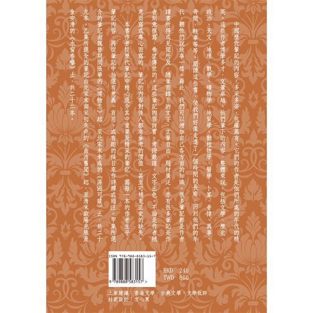 本書作者從歷代筆記中精心選介其中重要及精采的筆記,寫每一本的作者生平、筆記內容,再從筆記中抽選有意義、有用、或有趣的條目來作詳釋或短注。甲集所選介的筆記由魏晉期間張華的《博物志》起,至北宋末朱彧的《萍洲可談》止,共二十九本。乙集所選介的筆記由北宋末南宋初朱弁的《曲洧舊聞》起,至清末歐陽兆熊及金安清的《水窗春囈》止,共二十二本。