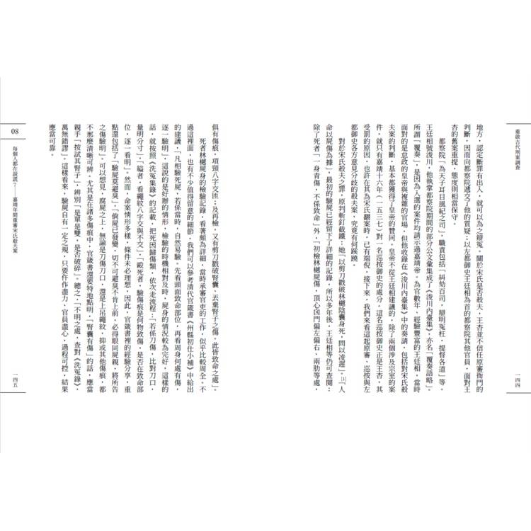 本書從多個層面展開深入解讀,細緻講解具體案件的官司審理過程,以及背後牽扯的多重複雜局面,代表性與特殊性兼具,並引用案卷檔案、地方志、私家史料等文獻資料,陳述有理有據,對古代司法體系進行專業剖析,並旁及刑案偵辦時的驗屍記錄和刑審技巧。書中案件主角涵蓋百姓、官場乃至皇室的生活與命運,同時兼論當時時代背景下的處理方式,司法公正與社會進步等議題。