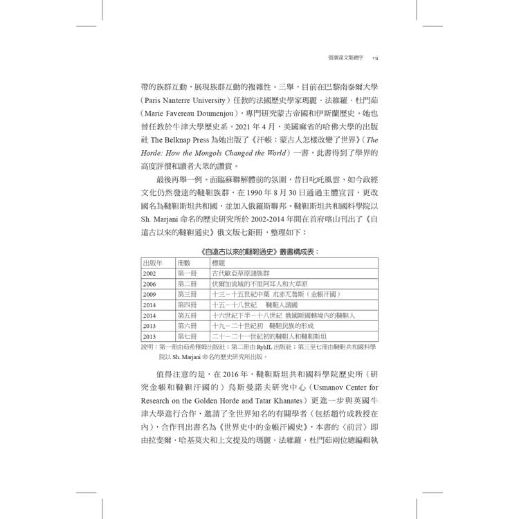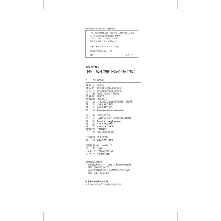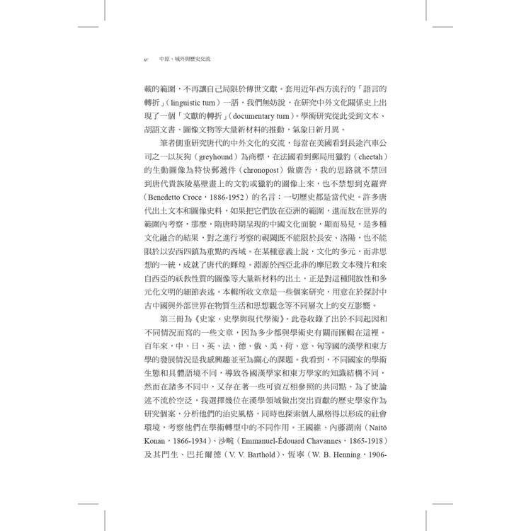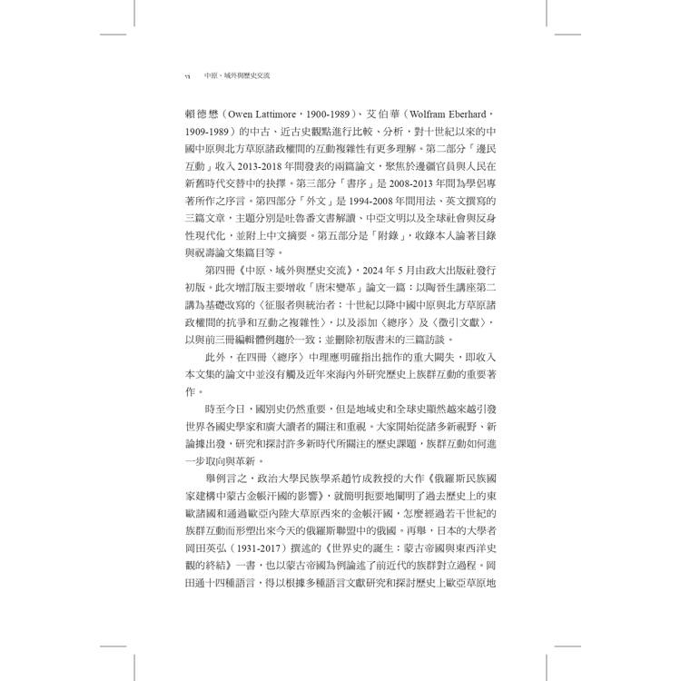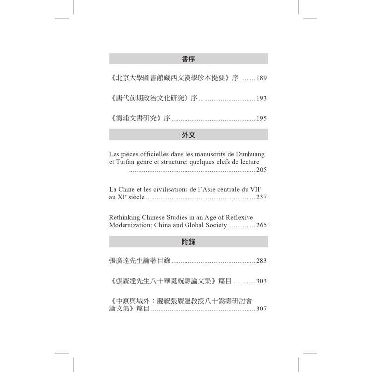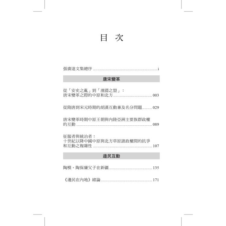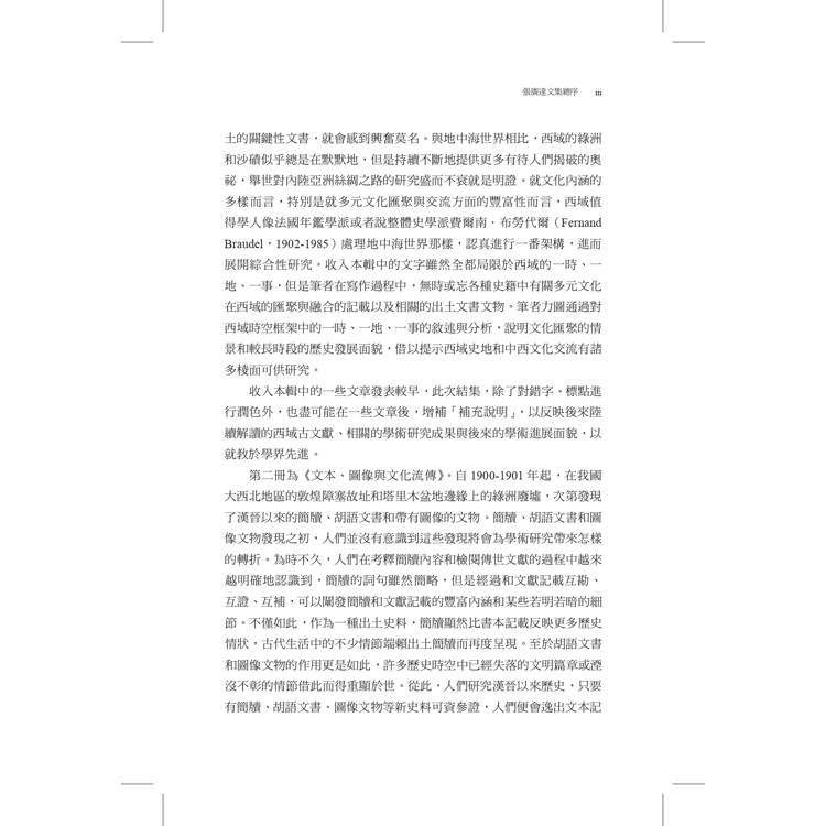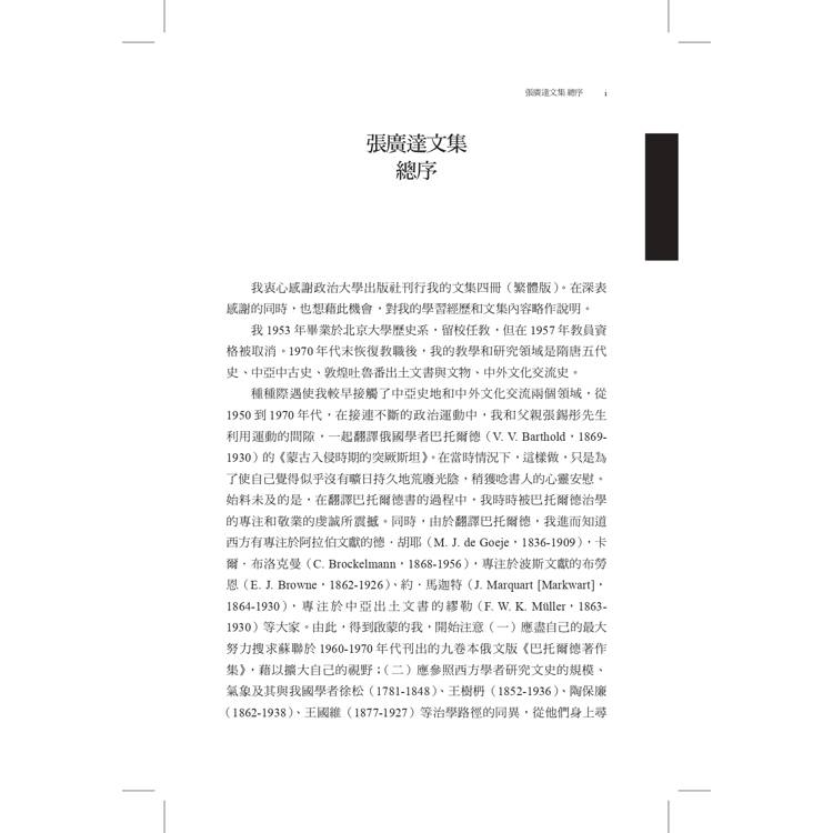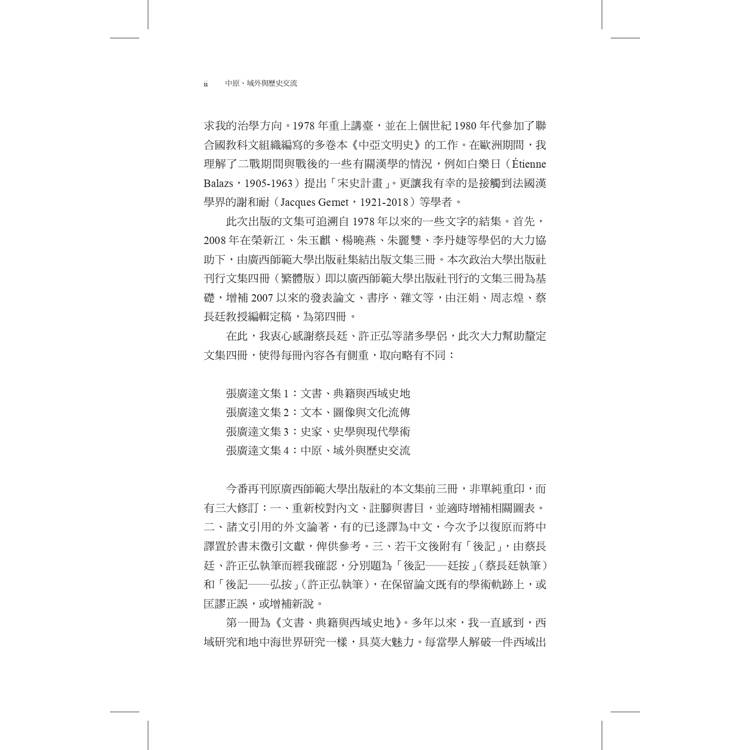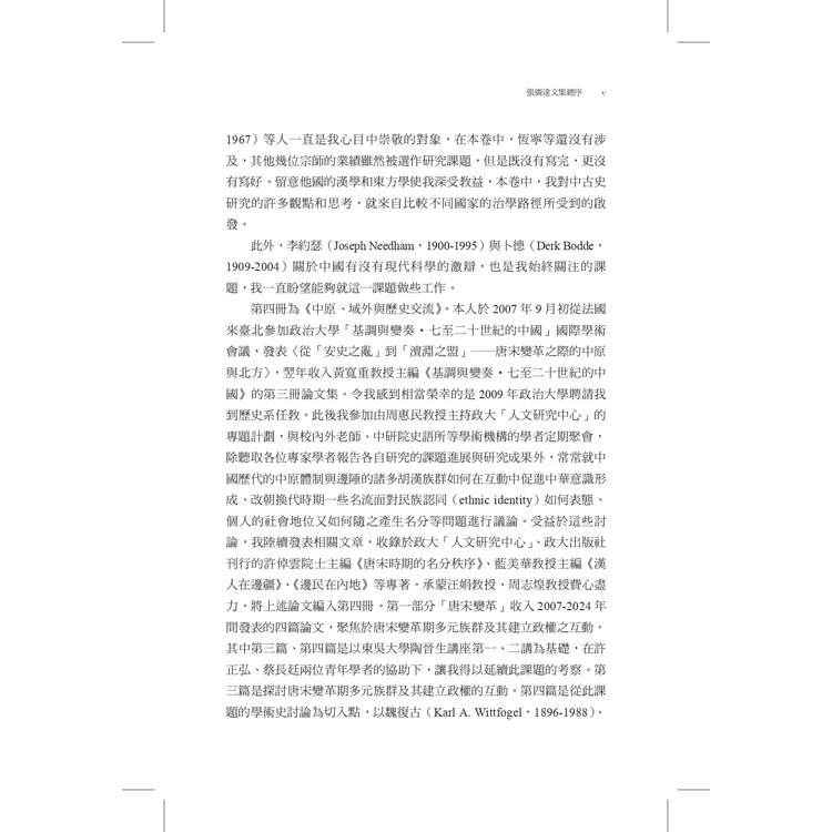 任教於政大歷史系期間,我参加了當時「政大人文研究中心」的專題計畫,與研究歴史上胡漢異同和胡漢互動有關課題的一些校内外老師,和中研院史語所等學術機構的學者定期聚會。聚會期間,除了聽取各位專家學者報告各自研究的不同課題的進展情況和取得的成果之外,常常就中國歷代的中原體制與邊陲的諸多胡漢族群的互動如何促進中華意識的形成、改朝換代時期一些名流面對民族認同(ethnic identity)問題如何表態、個人的社會地位如何產生名分等問題,定期在學術會議上進行交流。這段期間,我追隨各位師友從事與我原來專業相關的課題研究,也寫出幾篇文章,論述隋唐以來中原與内陸亞洲的遊牧族群互動、胡漢認同和確定名分秩序、邊民在內地、清代内地長官在邊陲等問題,形成了這本文集的主體部分。此次增訂版主要增收「唐宋變革」論文一篇〈征服者與統治者:十世紀以降中國中原與北方草原諸政權間的抗爭和互動之複雜性〉,以及添加〈總序〉及〈徵引文獻〉,並刪除初版書末的三篇訪談,以與前三冊編輯體例趨於一致。——張廣達