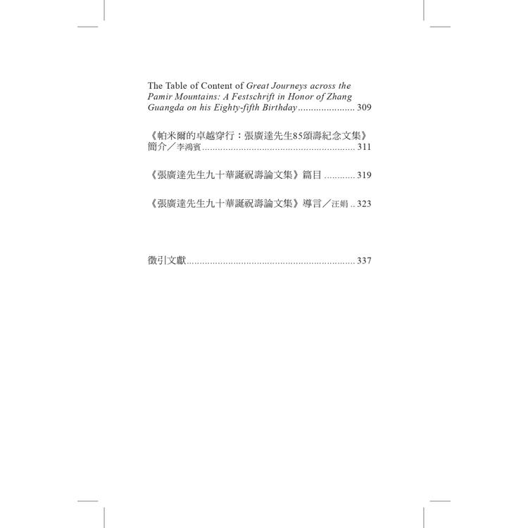 The Table of Content of Great Journeys across the Pamir Mountains: A Festschrift in Honor of Zhang Guangda on his Eighty-fifth Birthday