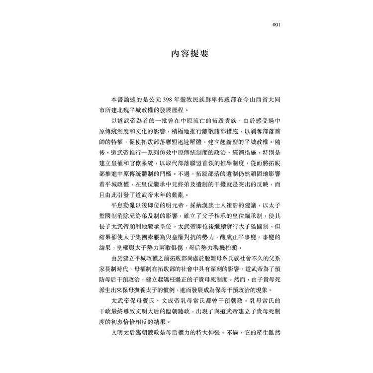 本書論述的是公元398年遊牧民族鮮卑拓跋部在今山西省大同市所建北魏平城政權的發展歷程。