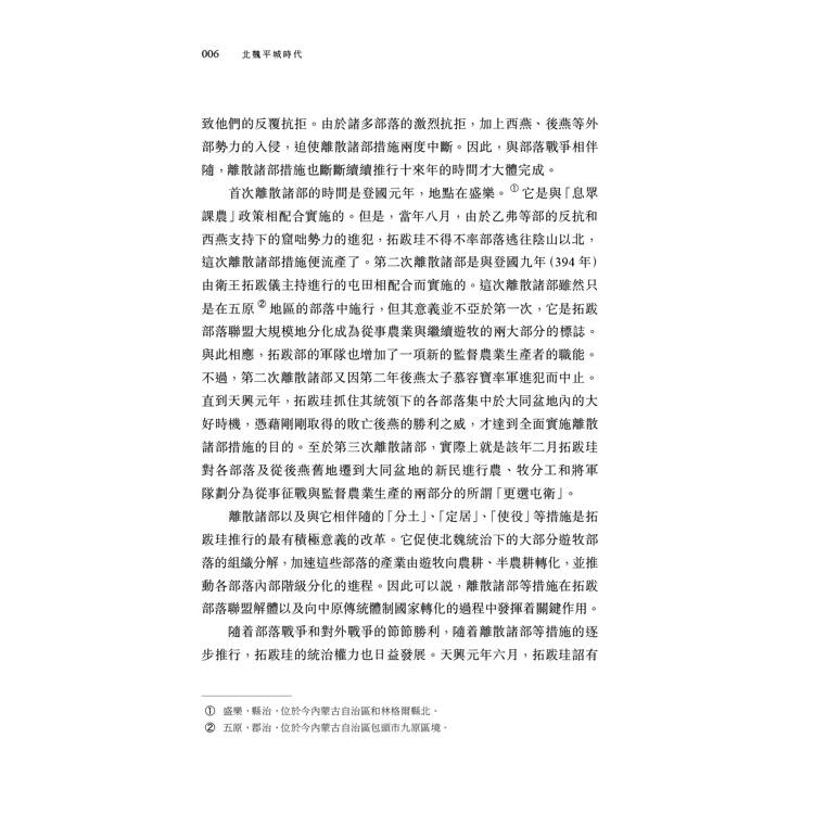 以道武帝為首的一批曾在中原流亡的拓跋貴族,由於感受過中原傳統制度和文化的影響,積極地推行離散諸部措施,以剝奪部落酋帥的特權,促使拓跋部落聯盟迅速解體,建立起新型的平城政權。隨後,道武帝推行一系列仿效中原傳統制度的政治、經濟措施,特別是建立皇權和官僚系統,以取代部落聯盟首領的推舉制度,從而將拓跋部推進中原傳統體制的門檻。不過,拓跋部落的遺制仍然頑固地影響?平城政權,在皇位繼承中兄終弟及遺制的干擾就是突出的反映,而且由此引發了道武帝末年的動亂。